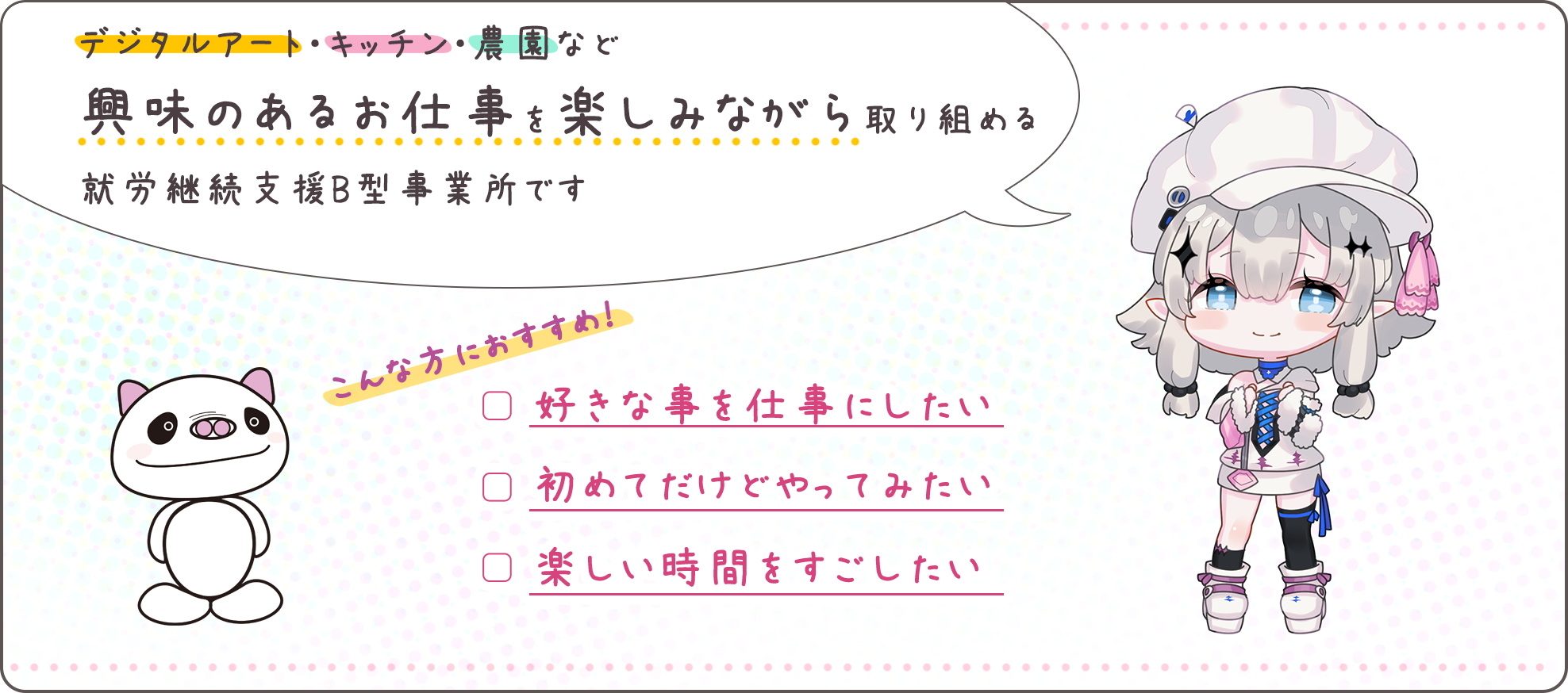 - アートスタッフ:PCを使った絵画(デジタルアート)等やアパレル品やその他グッズの制作補助及び製品販売。